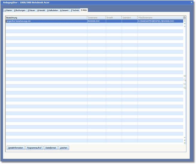 Rufen Sie im Hauptmenü den Punkt „Anlagenbuchhaltung /Anlagegüter / Buchungen" auf. Über die vorgelagerte Auswahltabelle können Sie ein Anlagegut auswählen und in Bearbeitung nehmen. Neben den bereits erläuterten Karteikarten der Anlagegutverwaltung wird Ihnen die Karteikarte „Akte" bereitgestellt. Diese Karteikarte ist der „elektronische Ordner" des Wirtschaftsgutes. Hier werden die zum gewählten Anlagegut gehörigen Dokumente verwaltet.