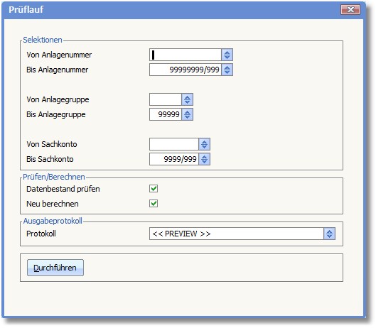 << Hier KLicken um eine Inhaltsübersicht anzuzeigen >> Navigation: Anlagenbuchhaltung > Prüflauf |