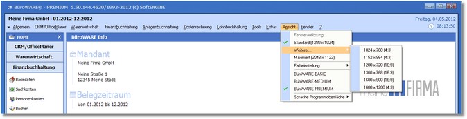 BüroWARE kann mit verschiedenen Fenstergrößen betrieben werden, einstellbar im Ansicht-Menü unter "Fensterauflösung". Dadurch ist es z.B. auf Dualmonitorsystemen möglich, die Applikation auf den gewünschten Screen zu verschieben.