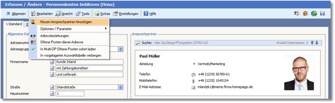 << Hier KLicken um eine Inhaltsübersicht anzuzeigen >> Navigation: Finanzbuchhaltung > Stammdaten > Personenkonten > Die Karteikarte "Adressauswahl" > Adressen erfassen/ändern > Ansprechpartner erfassen/ändern |