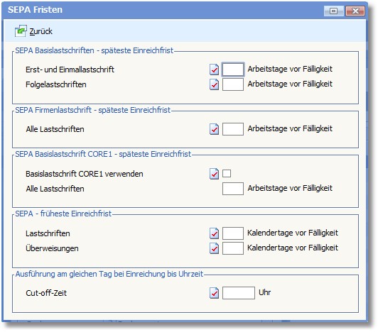 In diesem Dialogfenster sind die Fristen für SEPA Firmen- und Basislastschriften zu hinterlegen: