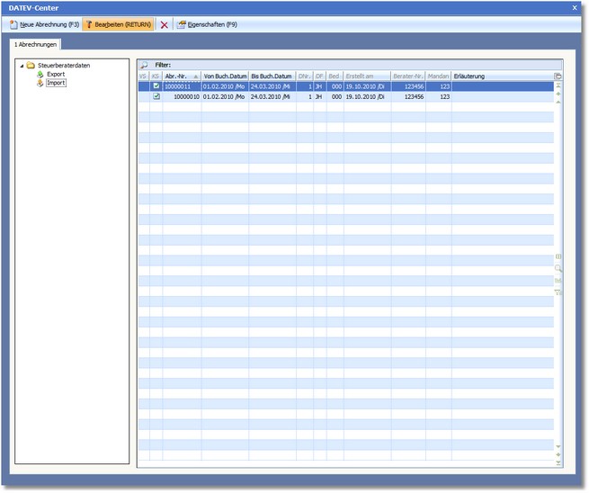 Die Bearbeitungsmaske "Datev-Center / Abrechnung bearbeiten - IMPORT" wird geöffnet.