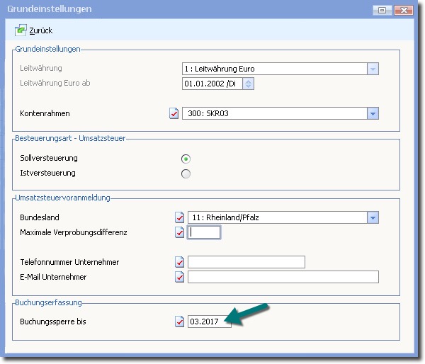 Diese Buchungssperre finden Sie in den Basisdaten, Menü "Bearbeiten", Menüeintrag "Grundeinstellungen".