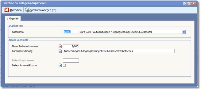 Mit [F10] wird der Vorgang gestartet. Das Programm legt das neue Sachkonto mit allen Parametern des bestehenden Kontos an.
