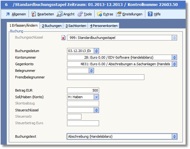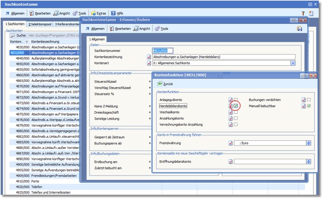 Parallel dazu wird die abweichende Abschreibung für die Handelsbilanz gebucht. Buchungen für die Handelsbilanz sind nur zwischen zwei als Handelsbilanzkonten gekennzeichneten Buchungen möglich. Das ist notwendig, da sonst Aktiva-Passiva-Ungleichheiten in der Steuerbilanz entstehen würden.