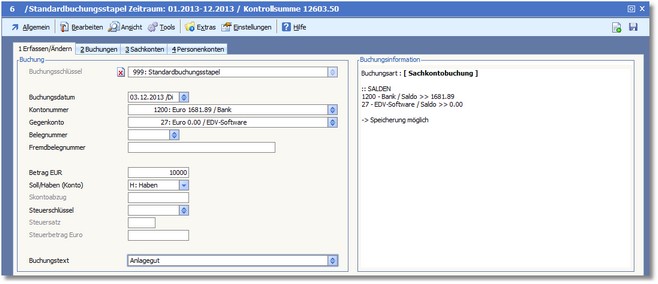 Buchen wir zur Verdeutlichung des Vorgehens einen Zugang auf das Anlagegutkonto:
