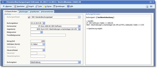 Das Sachkonto des Anlagegutes ist 27 (EDV-Software).
