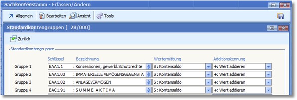 Die Einstellungen der Standardgruppen müssen mit dem ursprünglichen Konto übereinstimmen (Sachkontenstamm - Erfassen/Ändern, Menü "Bearbeiten > Kontogruppen > Standardkontogruppen"):