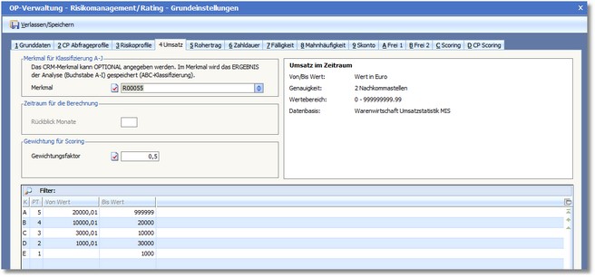 Sämtliche ABC-Analysen können nun für die Ermittlung des Scorewertes herangezogen werden - und zwar unterschiedlich gewichtet. Für die Bonitätseinstufung ist ggf. der Umsatz weniger von Bedeutung wie die