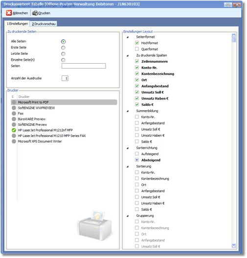 Oft geht es nicht um einzelne Informationen. Häufig benötigt man tabellarische Übersichten, zum Beispiel zu den Außenständen eines Kunden. Drucken Sie mithilfe des Druckassistenten direkt aus der selektierten Tabelle heraus – auf Papier und/oder als PDF.