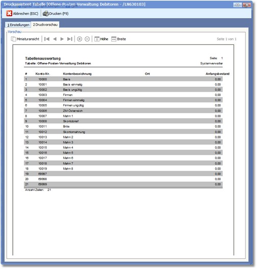 In der Druckvorschau können Sie eine Vorschau der Druckausgabe mit den im Vorfeld eingestellten Druckparametern sehen und dann mit der [F9]-Taste einfach ausdrucken.