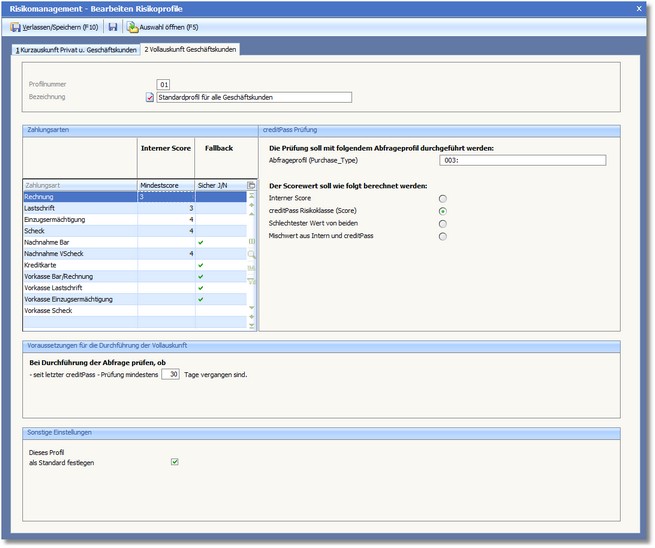 << Hier KLicken um eine Inhaltsübersicht anzuzeigen >> Navigation: Finanzbuchhaltung > Laufende Vorgänge > OP-Verwaltung > Debitorenkennzahlen/Rating > Debitorenrating einrichten > Die Karteikarte "Risikoprofile" > Risikoprofile bearbeiten > Vollauskunft (Geschäftskunden) |