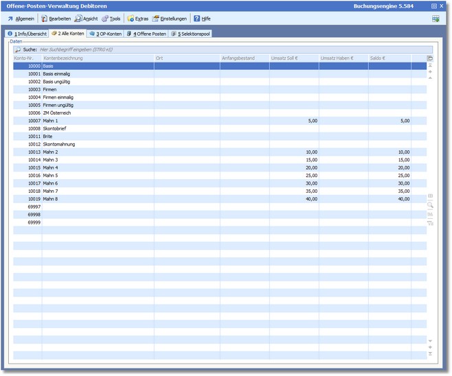 Auf der Karteikarte "Alle Konten" werden alle Debitoren bzw. Kreditoren angezeigt – unabhängig davon, ob diese über Offene Posten verfügen oder nicht. Diese Art der Darstellung entspricht im Wesentlichen der bisherigen OP-Verwaltung (bis einschl. Version 5.57).