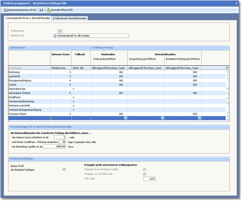 In diesem Dialog werden einmalig Einstellungen zum jeweiligen Risikoprofil vorgenommen. Diese Einstellungen werden in Abstimmung mit dem creditPass®-Berater vorgenommen und ermöglichen individuelle Abfrage-Einstellungen je Zahlungsart.