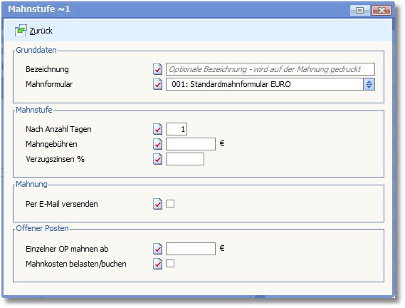 Tragen Sie hier die Anzahl der Tage ein die vergehen müssen, bevor ein Offener Posten diese Mahnstufe erreicht.