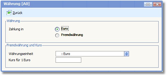 Mit der Funktionstaste [F5] können Sie hier die Auswahltabelle der Währungseinheiten aufrufen, in der Sie die gewünschte Fremdwährung auswählen und mit [RETURN] in das Feld übernehmen können.