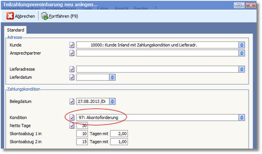 b) Aufgrund der obigen Einstellungen wird beim Anlegen einer neuen Teilzahlungsvereinbarung im Feld KONDITION "Akontoforderung" automatisch eingetragen.