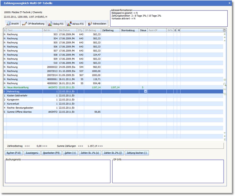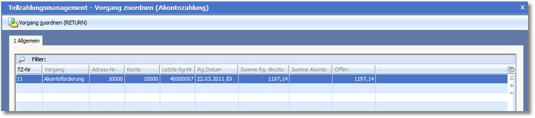 Nach Speicherung der Buchung mit [F10] öffnet sich das TZ-Fenster mit den bereits erfassten Teilzahlungsvorgängen innerhalb dieses Kunden.