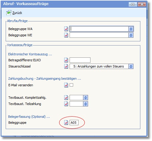 2. Hier kann dann die Beleggruppe - z.B. "A05 für Vorkasse" - definiert werden, welche vorher im Designer freigegeben werden muss.