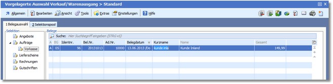 Nach Verlassen des Beleges wird der Vorkasseauftrag in der Auswahltabelle dargestellt.