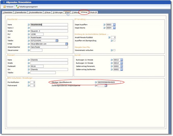 1. Es muss in der Registerkarte "8 Extras" des Firmenstamms die Gläubigeridentifikationsnummer vorhanden sein.