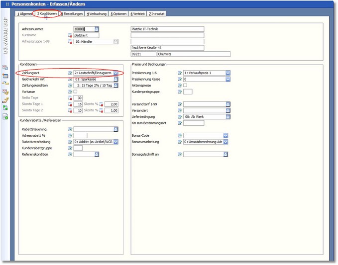 3. In der Registerkarte "2 Konditionen" der Personenkonten ist die Zahlungsart (Einzugsermächtigung oder Abbuchungserlaubnis) einzutragen.