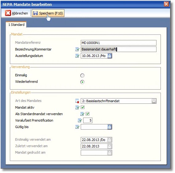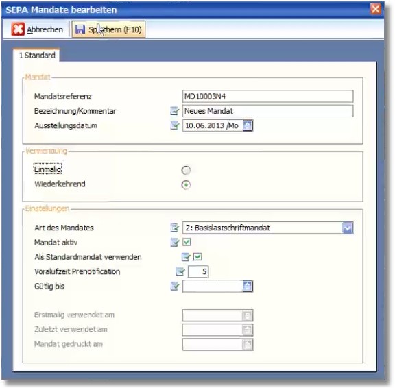 6. Füllen Sie die notwendigen Felder und speichern Sie das neue Mandat mit [F10].