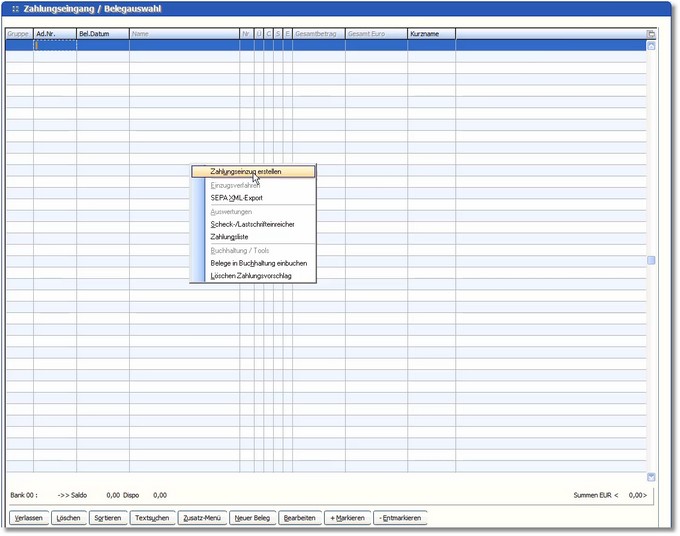 1. Öffnen Sie nun den Zahlungseingang und klicken Sie mit der rechten Maustaste, um über das Kontextmenü den Zahlungseinzug zu erstellen.
