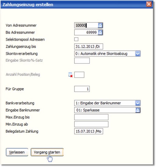 (Zur Erstellung des Zahlungseinzugs sollte der Kunde einen offenen Posten haben)