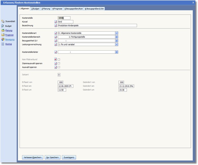 Diese Karteikarte nimmt die allgemeinen Daten zur Kostenstelle auf.
