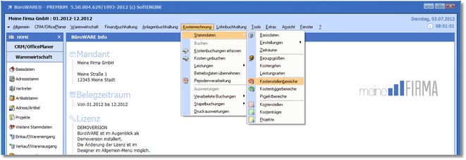 1. Klicken Sie mit der Maus im Hauptmenü auf "Kostenrechnung > Stammdaten > Kostenstellenbereiche".