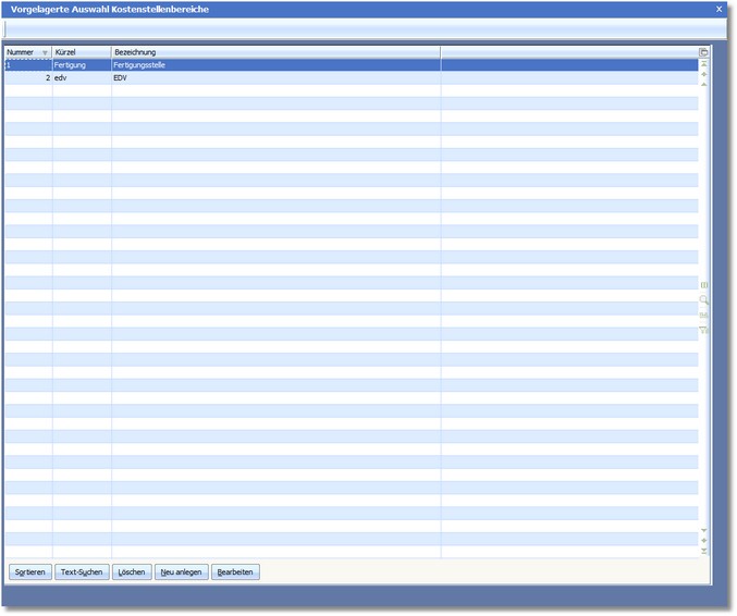 Das Programm öffnet die vorgelagerte Auswahltabelle der Kostenstellenbereiche.
