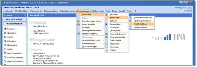 1. Klicken Sie mit der Maus im Hauptmenü auf "Kostenrechnung > Stammdaten > Einstellungen > Projektschablonen".