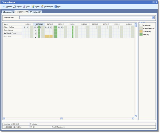 << Hier KLicken um eine Inhaltsübersicht anzuzeigen >> Navigation: CRM/OfficePlaner > Terminverwaltung > Tagesplanung > Karteikarte "Gruppenansicht" |