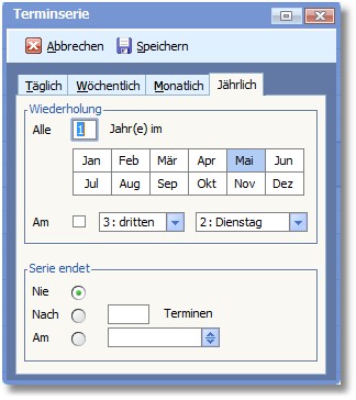 << Hier KLicken um eine Inhaltsübersicht anzuzeigen >> Navigation: CRM/OfficePlaner > Terminverwaltung > Terminplanung > Arbeiten mit Terminen > Termine periodisch wiederholen (jährlich) |