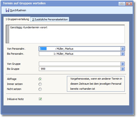 Der Gruppentermin wird generell gesetzt, d.h. der eingetragene Termin des Mitarbeiters wird durch den Gruppentermin ersetzt.