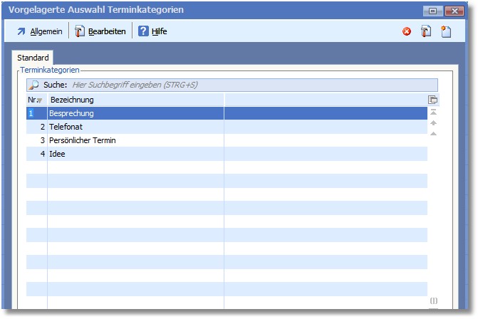 Das Programm öffnet die vorgelagerte Auswahltabelle der Terminkategorien.