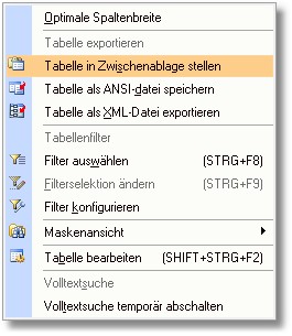 2. Im Auswahlmenü klicken Sie mit der Maus auf den Eintrag "Tabelle in Zwischenablage stellen".