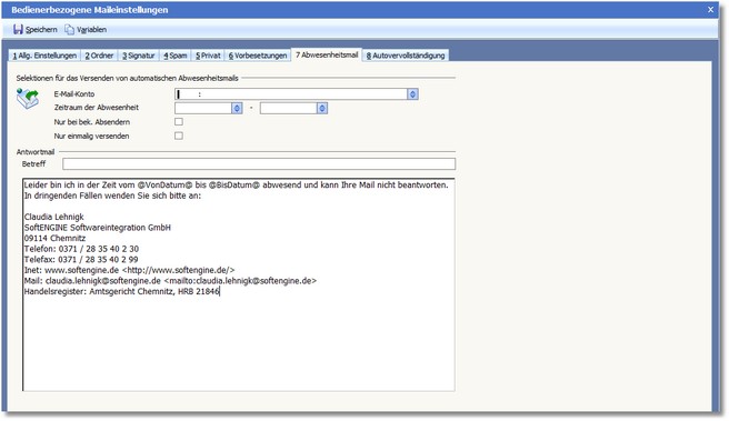 Die Karteikarte "Abwesenheitsmail"