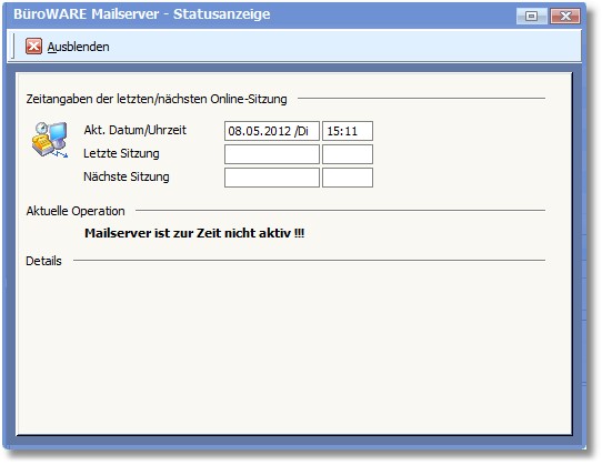 << Hier KLicken um eine Inhaltsübersicht anzuzeigen >> Navigation: CRM/OfficePlaner > Mailsystem > Mail einrichten > E-Mail-Assistent - Extras > Mail-Server Statusanzeige |