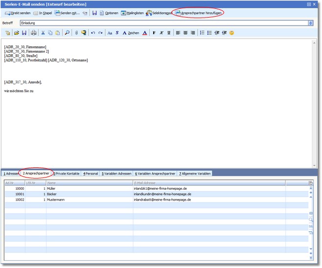 Wenn einzelne Ansprechpartner die Mail erhalten sollen, können Sie über die Karteikarte "Ansprechpartner" diese auswählen und in die Liste der Mailempfänger aufnehmen.