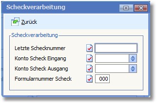 In dieses Feld wird die letzte Schecknummer zurückgeschrieben, die das Programm für den Scheckdruck im Zahlungsverkehr verwendet hat. Diese Nummer ist zugleich die Startnummer für den nächsten Scheckdruck.