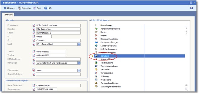 Die Sprachverwaltung ermöglicht die Definition von bis zu 99 Fremdsprachen. Außerdem besteht die Möglichkeit, die Belegübernahmetexte in der jeweiligen Fremdsprache zu erfassen.