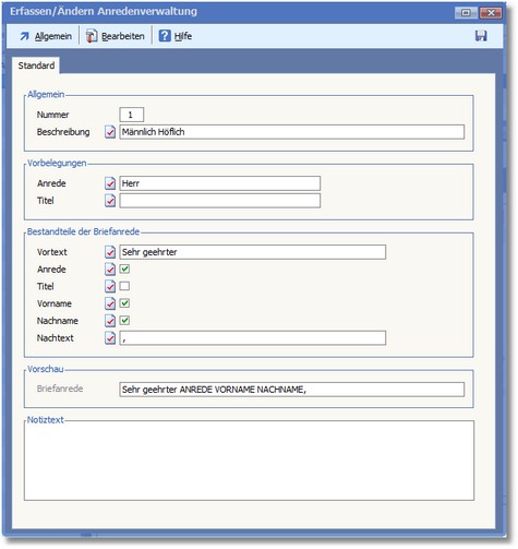 Navigation:  CRM/OfficePlaner > Stammdaten > Adressstamm > Adressstamm - Menü > Anredenverwaltung > Anrede erfassen/ändern >