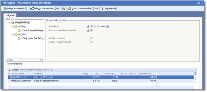 Der Warenkorb wird nun entsprechend der vorher festgelegten Einstellungen mit Artikelpositionen gefüllt und geöffnet.