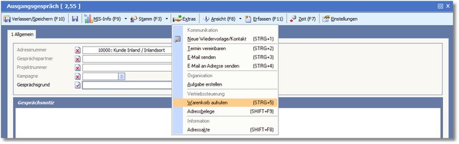 1. Hinterlegen Sie zunächst in den Basisdaten der Warenwirtschaft bzw. in den Adressdaten zunächst grundlegende Einstellungen für den Warenkorb. 2. Erfassen Sie für eine Adresse ein Ausgangsgespräch mit [STRG]+[SHIFT]+[A] oder ein Eingangsgespräch mit [STRG]+[SHIFT]+[E]. 3. Drücken Sie hier nun die Tastenkombination [STRG]+[5]