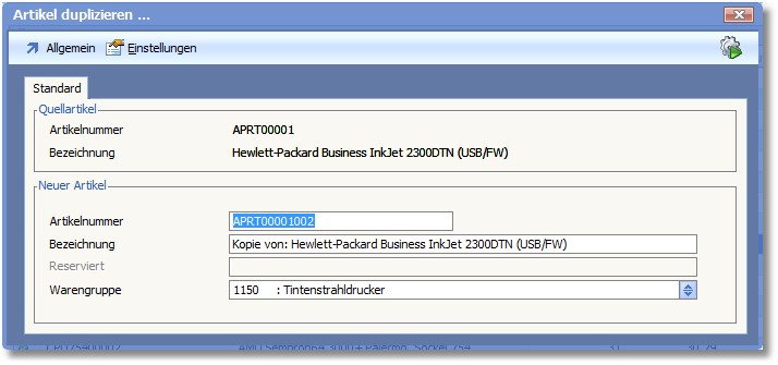 Mittels dieser Funktion können Sie neue Artikel erfassen. Das Programm kopiert alle Einstellungen des bestehenden Artikels in den neuen Artikel. Diese Vorgehensweise erspart Ihnen die Parameterisierung bei der Neuanlage von Artikeln und ist wenig fehleranfällig.