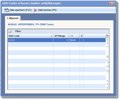 Das Programm öffnet den Dialog "EAN-Codes erfassen/ändern artikelbezogen".