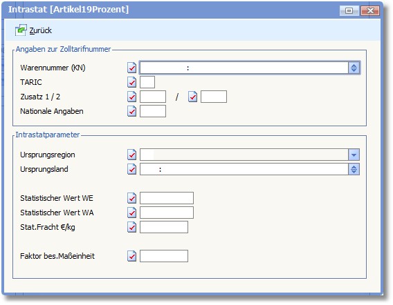 << Hier KLicken um eine Inhaltsübersicht anzuzeigen >> Navigation: Warenwirtschaft > Stammdaten > Artikelstamm > Artikel erfassen/ändern > Artikel erfassen/ändern - Menüleiste > Intrastat |