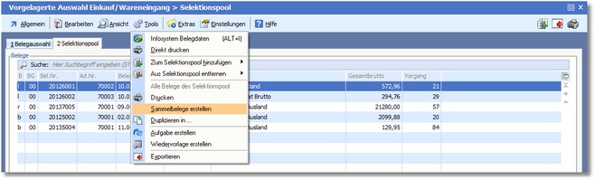 2. Wählen Sie im Selektionspool den Menüpunkt "Tools > Sammelbelege erstellen".